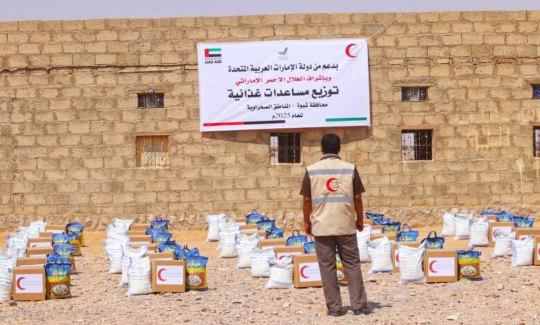 وقال مدير مكتب الهلال الأحمر الإماراتي في محافظة شبوة، ماجد بن سريع، إن المساعدات الغذائية تستهدف البدو الرحل للتخفيف من معاناتهم نظراً للضروف المعيشية الصعبة التي تعاني فيها الأسر من صعوبة توفير احتياجاتها الضرورية، نتيجةً لإرتفاع الأسعار.