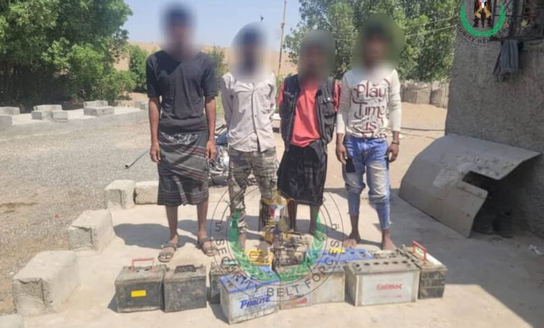 وأضاف المصدر أن قوات الحزام الأمني بقطاع الحسيني تمكنت، مساء أمس، من إلقاء القبض على أفراد العصابة متلبسين أثناء قيامهم بسرقة عدة بطاريات من إحدى الشاحنات.