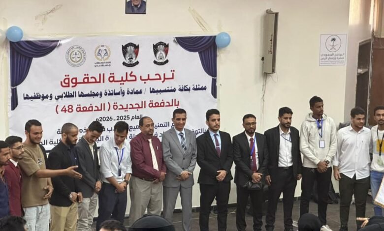 أقامت كلية الحقوق بجامعة عدن حفلاً مميزاً لاستقبال الدفعة (48) من طلاب كلية الحقوق ، بتنفيذ من المجلس الطلابي وتحت إشراف عميد كلية الحقوق الدكتور محمد صالح محسن.
