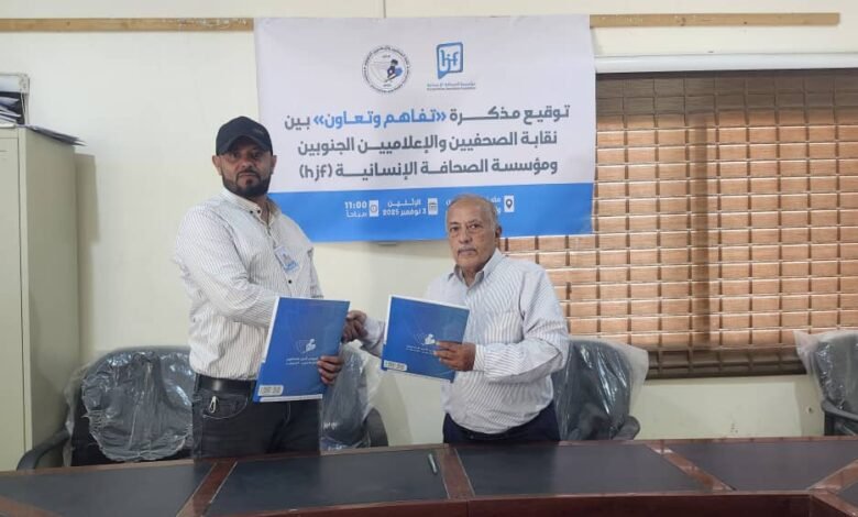 شهدت العاصمة عدن اليوم الاثنين 3 نوفمبر 2025 توقيع مذكرة تفاهم وتعاون إعلامي نوعية بين مؤسسة الصحافة الإنسانية (hjf)، ممثلة برئيسها بسام القاضي، ونقابة الصحفيين والإعلاميين الجنوبيين، ممثلة بنقيبها عيدروس باحشوان.