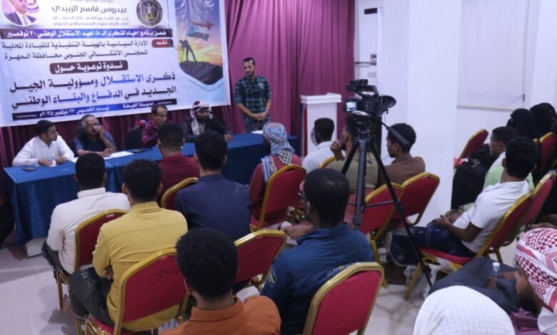 شهدت مدينة الغيضة عصر هذا اليوم الخميس فعالية توعوية بعنوان ذكرى الاستقلال ومسؤولية الجيل الجديد في الدفاع والبناء الوطني ، نظمتها الإدارة السياسية بالهيئة التنفيذية للقيادة المحلية للمجلس الانتقالي الجنوبي بمحافظة المهرة، وذلك ضمن برنامج فعاليات الذكرى الـ58 لعيد الاستقلال الوطني 30 نوفمبر ، وبرعاية الرئيس القائد عيدروس قاسم الزُبيدي رئيس المجلس الانتقالي الجنوبي القائد الأعلى للقوات المسلحة الجنوبية.