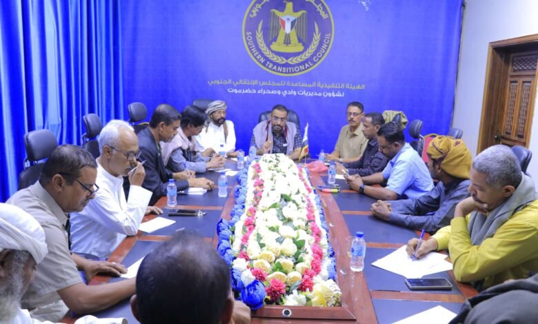عقدت الهيئة التنفيذية المساعدة للمجلس الانتقالي الجنوبي لشؤون مديريات وادي وصحراء حضرموت، اليوم السبت، اجتماعها الدوري الأول لشهر ديسمبر، لمناقشة مستجدات الأوضاع في المديريات، وخطط العمل للفترة القادمة.