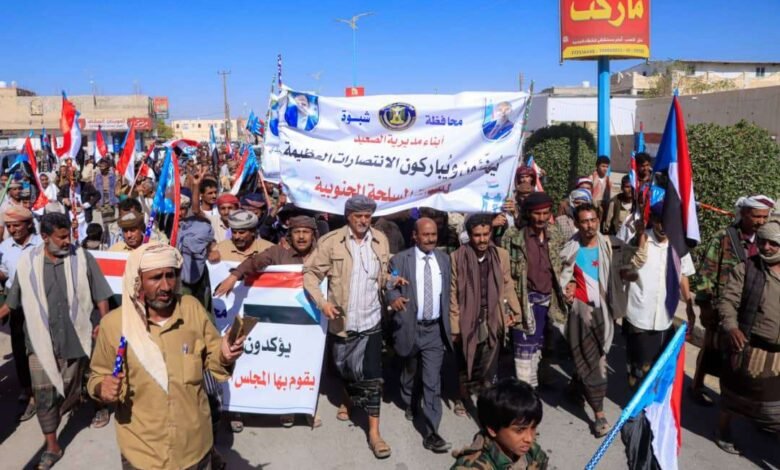 انتقالي شبوة ينظم مسيرة جماهيرية احتفالًا بانتصارات القوات الجنوبية في عارين وحضرموت