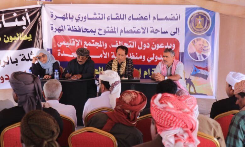 وجاء اللقاء بمشاركة قيادة المجلس الانتقالي الجنوبي بمحافظة المهرة، وأعضاء فريق الحوار الوطني الجنوبي، إلى جانب أعضاء الجمعية الوطنية وأعضاء مجلس المستشارين، وعدد من أعضاء القيادة المحلية وأعضاء الهيئة التنفيذية مع استمرار الحضور الجماهيري الواسع من المعتصمين.
