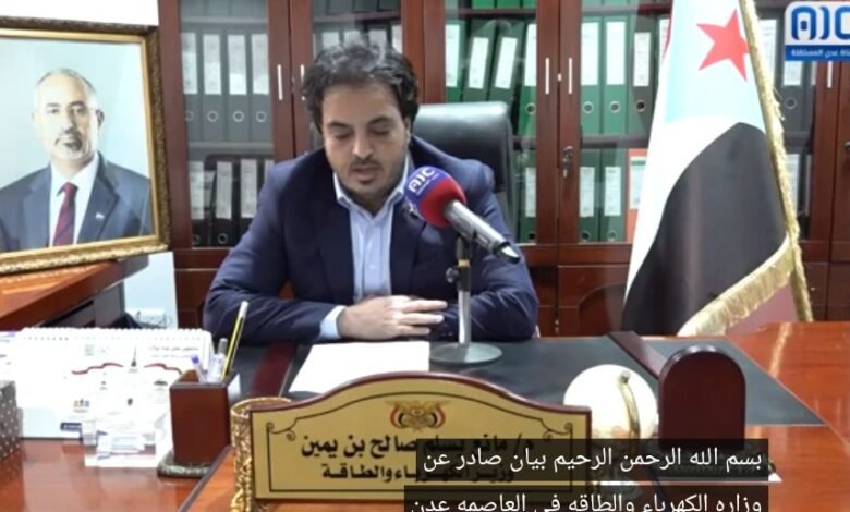 وزارة الكهرباء والطاقة ممثلة بالوزير مانع بن يمين تعلن تأييدها لخطوات المجلس الانتقالي والقوات المسلحة الجنوبية لإعلان دولة الجنوب العربي