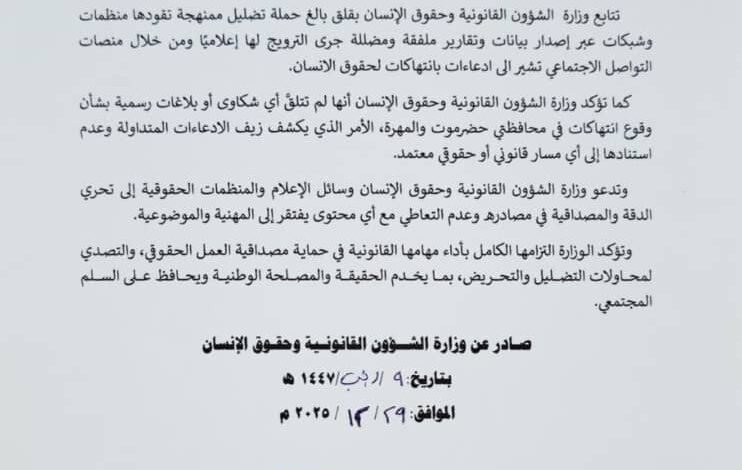 كما تؤكد وزارة الشؤون القانونية وحقوق الإنسان أنها لم تتلقَّ أي شكاوى أو بلاغات رسمية بشأن وقائع انتهاكات لحقوق الإنسان، وأن ما يتم تداوله من ادعاءات لا يستند إلى أي مسار قانوني أو حقوقي معتمد.