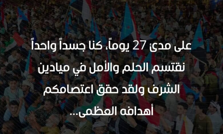 على مدى 27 يوماً، كنا جسداً واحداً، نقتسم الحلم والأمل في ميادين الشرف، واليوم، نزف إليكم ثمرة هذا الثبات الأسطوري، فبمباركة صمودكم، أعلن الرئيس القائد عيدروس قاسم الزُبيدي البيان السياسي التاريخي الذي رسم معالم دولتنا القادمة، وتوّج هذا المسار بإقرار “دستور دولة الجنوب العربي”، الوثيقة التي تضمن حقوقنا وتحدد هويتنا وتؤسس لمستقبل يسوده العدل والقانون.