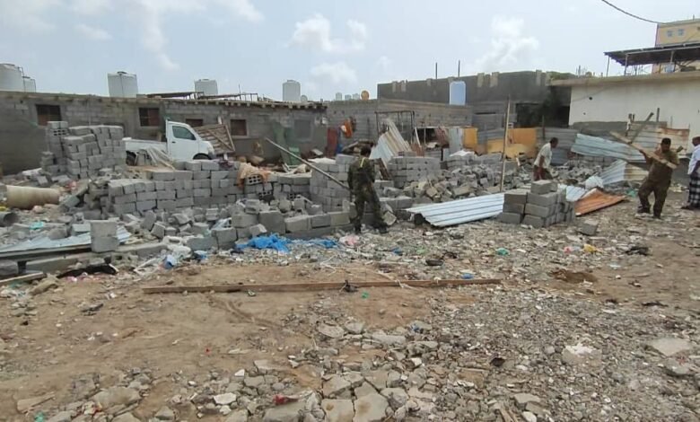 حماية الأراضي تزيل بناء عشوائي طال أرضية مواطن في بئر فضل بالعاصمة عدن