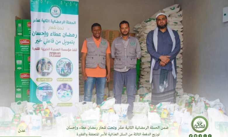 في مشهدٍ إنسانيٍّ يفيض بالعطاء، وتحت ظلال الرحمة التي تكتنف أيام شهر رمضان المبارك، تواصل مؤسسة الهجرة الخيرية للتنمية مسيرتها المباركة في مدّ جسور الخير إلى الأسر المتعففة والفقيرة في مختلف مديريات محافظة عدن، ضمن الحملة الرمضانية الثانية عشر، و تحت شعار (رمضان عطاء وإحسان).