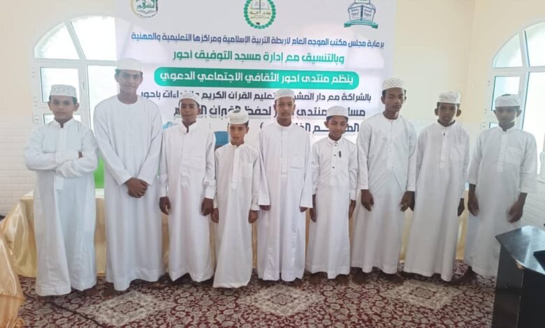 تواصلت لليوم الثاني على التوالي فعاليات مسابقة حفظ القرآن الكريم التي ينظمها منتدى أحور الثقافي الاجتماعي الدعوي بالشراكة مع دار المشهور لتعليم القرآن والقراءات، وبالتنسيق مع إدارة مسجد التوفيق، وبرعاية مجلس مكتب الموجّه العام لأربطة التربية الإسلامية.