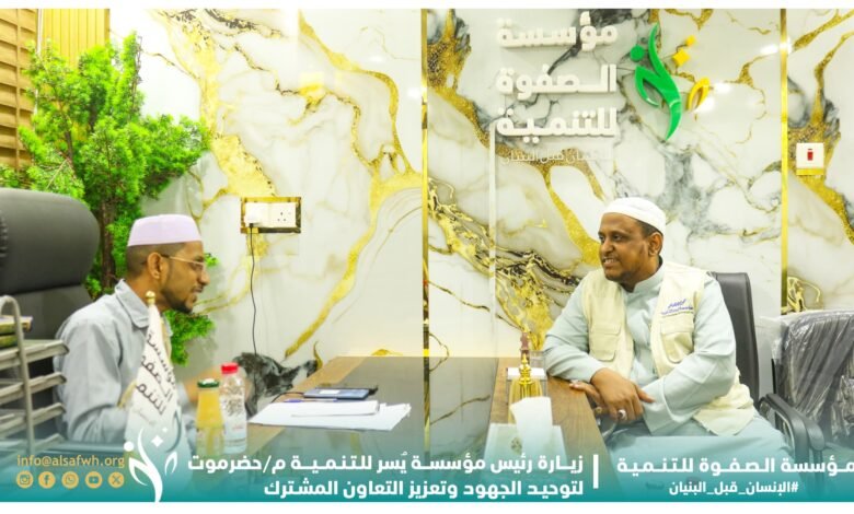 استقبل الأستاذ عمر سالم باصم، رئيس مؤسسة الصفوة للتنمية بالعاصمة عدن، رئيس مؤسسة يُسر للتنمية بمحافظة حضرموت، الأستاذ فواز باحمل، في زيارة رسمية هدفت إلى تعزيز جسور التعاون وبحث فرص التكامل في العمل الإنساني والتنموي بين الجانبين.