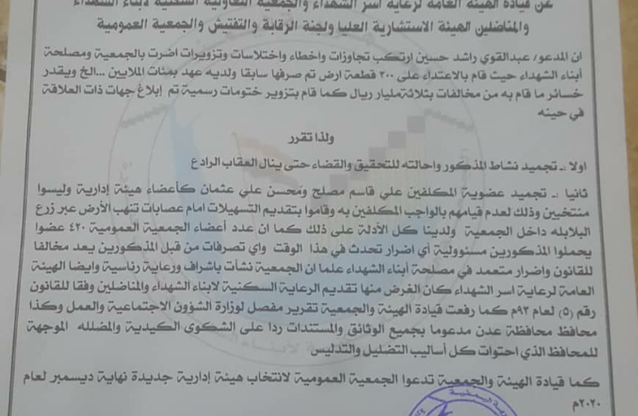 وفي نفس السياق قامت قيادة الهيئة العامة لرعاية أسر الشهداء والجرحى تجميد عضوية الأخ علي قاسم مصلح والأخ محسن علي عثمان كأعضاء للهيئة الإدارية للجمعية لعدم قيامهم بالواجب المكلفين به من قبل الجمعية بل وقاموا بتسهيل مخالفات ناهبي ولوبي الأراضي وكذا زرع البلبلات بين أعضاء الجمعية .