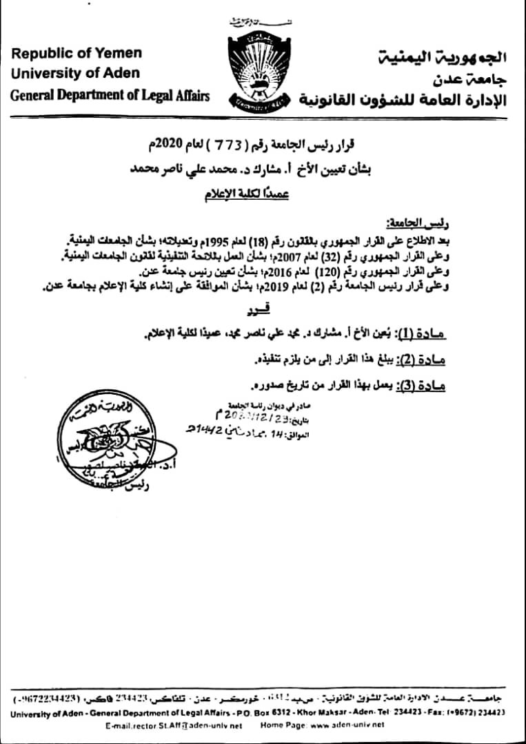 أصدر الأستاذ الدكتور الخضر ناصر لصور رئيس جامعة عدن قرارًا بتعيين عميدًا لكلية الإعلام بالجامعة.