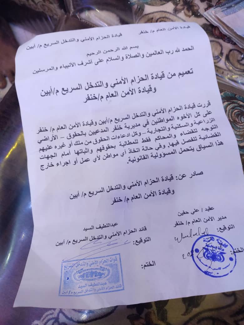 أصدرت قيادتا الحزام الأمني والتدخل السريع في محافظة أبين والأمن العام في مديرية خنفر تعميماً هاماً حيث