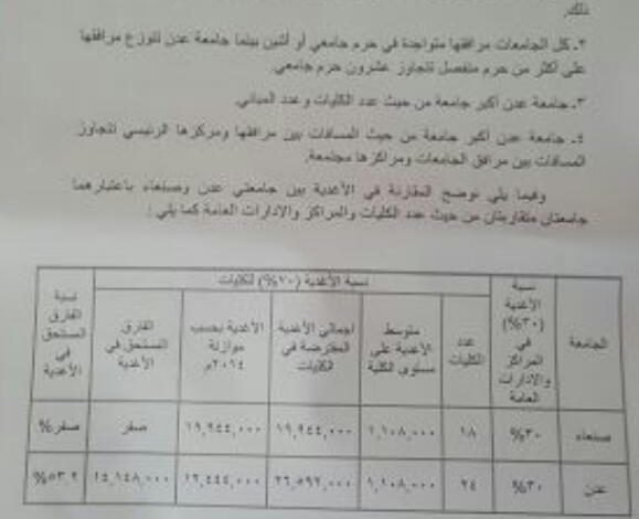 و فضحت التسريبات أنه قد تم تخصيص ما نسبته( 70% )من الأغذية في جامعة صنعاء للكليات ببالغ (19,944,000) ريال يمني، التي تقدر عدد كلياتها بـ(18 كلية) ومتوسط الأغذية لكل كلية فيها(1,108,000) ريال يمني وعكس متوسط الأغذية في كليات جامعه صنعاء على كليات جامعة عدن البالغ عددها (24 كلية) وعليه فأن الأغذية المستحقة لكليات جامعة عدن بلغت (26,592,000) حيث يتبين الفارق المستحق من الأغذية لجامعة عدن بـ(14,148.000) وبنسبة فارق (53.2%)