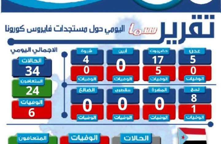 وتوزعت حالات الوفيات الـ 6 على حضرموت ولحج بـ 5 و 1 على التوالي