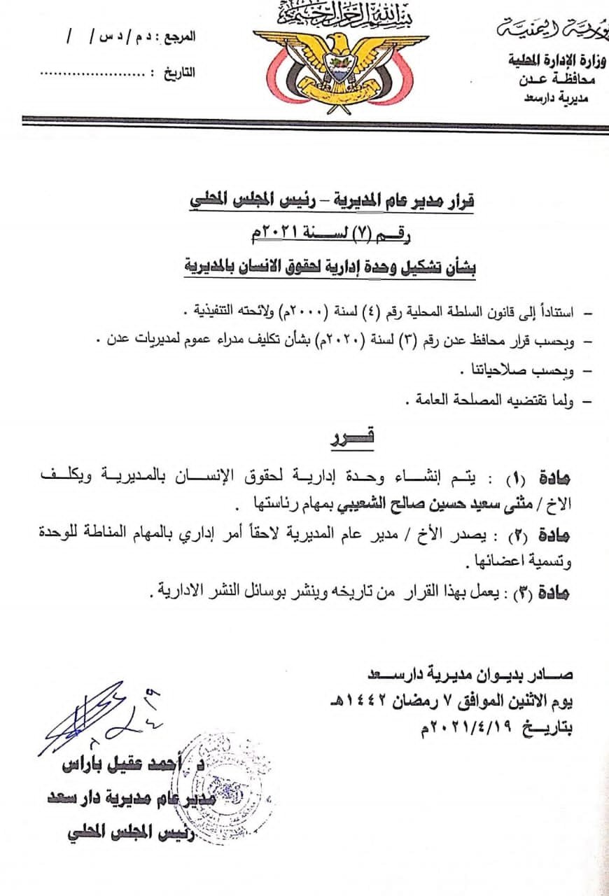 أصدر الدكتور أحمد عقيل باراس مدير عام مديرية دار سعد قراراً إداريا بإنشاء وحده إدارية جديدة تختص بحقوق الإنسان بالمديرية.