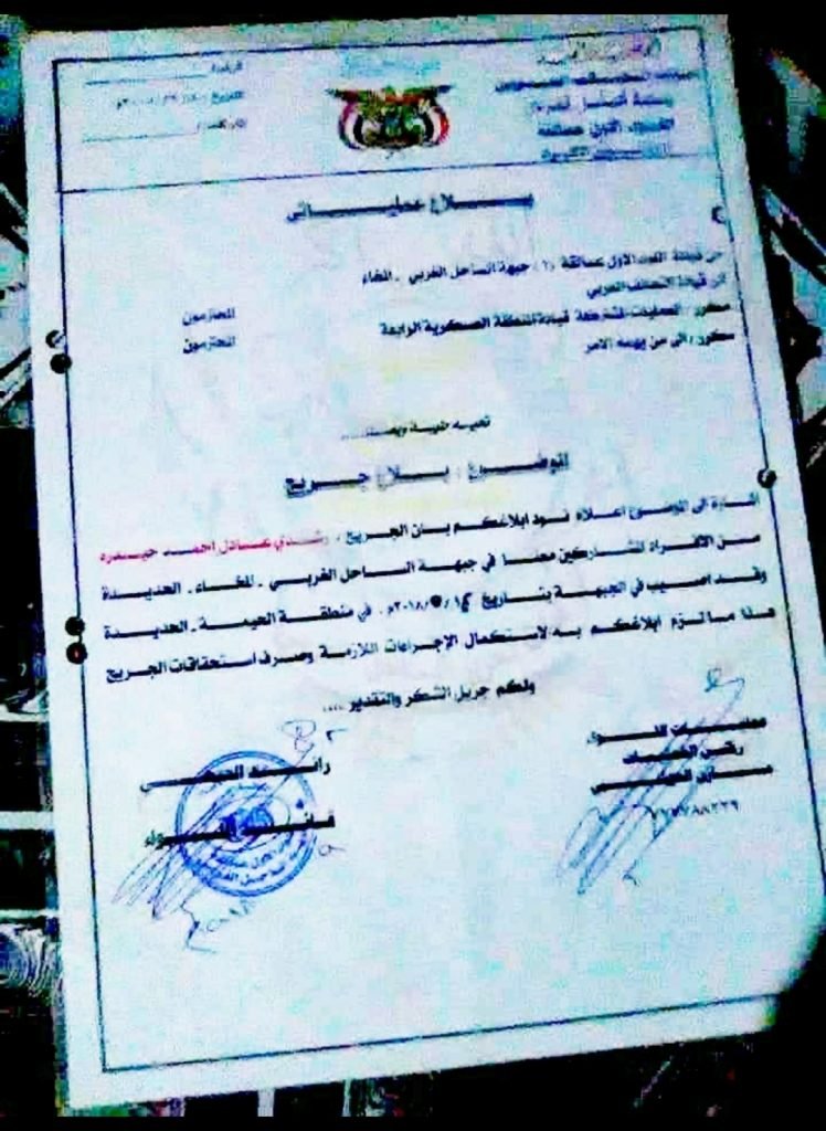 وأردف والد الشهيد قائلاً ولدي أحد افراد قوات اللوا الثاني حزم التابع للقائد فضل حسن العمري وقد سبق وإن أصيب بجراح في الجبهة بتاريخ 2018/5/14م وظل محروم من مرتباته لسنوات بعدها التحق بجبهة الساحل الغربي في اللواء الاول عمالقة واستشهد في تاريخ 2020/10/17م والى يومنا هذا لم نستلم راتب الشهيد رغم المتابعات والوساطات إلا ان قائد المنطقة رفض تسليم مستحقات ولدنا الشهيد
