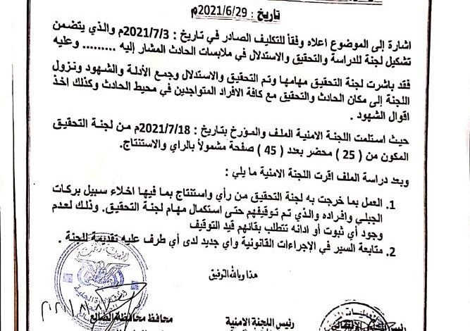 و أوضحت اللجنة إنه وفقًا للتكليف الصادر بتاريخ 3 تموز 2021 للميلاد، و الذي يتضمن تشكيل لجنة للدراسة و التحقيق و الإستدلال في ملابسات الحادث اليه .. و عليه فقد باشرت لجنة التحقيق مهامها و تم و التحقيق و الإستدلال و جمع الأدلة و الشهود و نزول اللجنة إلى مكان الحادث و التحقيق مع كافة الأفراد المتواجدين في محيط الحادث و كذلك أخذ أقوال الشهود.