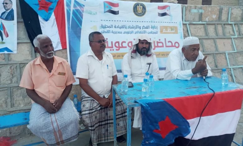 باشراف الهيئة التنفيذية للقيادة المحلية للمجلس الانتقالي الجنوبي بمديرية القطن نفذت إدار ة الوعظ والارشاد عصر اليوم الجمعة 2021/10/29محاضرة بعنوان( حب الوطن والدفاع عنه و نبذ السلوكيات الخاطئة والظواهر السلبية في المجتمع ) وذلك في المركز ( ألف ) ضاحية اعلا الروضة بمدينة القطن.