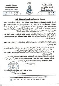صادر عن اجتماع اتحاد مقاولين أبناء محافظة المهرة – الغيضة ٢٠٢١/١١/١م.