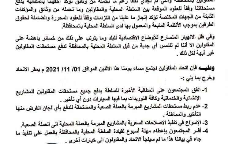 في ظل المتابعات المستمرة لدى السلطة المحلية بمحافظة المهرة من قبل الهيئة الإدارية لاتحاد المقاولين بالمحافظة والتي لم تجدي نفعا رغم ما نحمله من وثائق تؤكد أحقيتنا بالمطالبة بدفع مستحقاتنا وفقا للعقود الموقعة بين السلطة المحلية والمقاولين وما نحمله من وثائق والمؤكدات الثابتة من الجهات المختصة تؤكد انجاز ما علينا من الالتزامات وفقا للعقود المحررة والضامنة لحقوق الطرفين بموجب الأنظمة المتبعة والمعمول بها لدى السلطة السلطة المحلية بالمحافظة.
