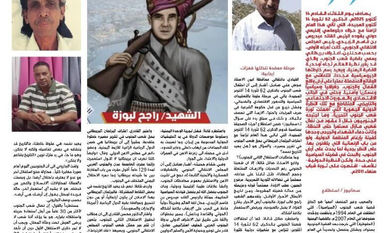 يصادف اليوم الثلاثاء القادم 14 أكتوبر 2025م، الذكرى 62 لثورة 14 أكتوبر المجيدة، التي تأتي هذا العام تزامناً مع حراك دبلوماسي إقليمي دولي يقوده الرئيس القائد عيدروس بن قاسم الزُبيدي، رئيس المجلس الانتقالي الجنوبي، كانت ثمرته الأولى، بحسب محللين، اعتراف بريطاني رسمي بقضية شعب الجنوب، والذي قد يغير نظرة العالم تجاه أوحدية القضية اليمنية، ويعيد رسم خارطتها الجيوسياسية مجدداً، لتتماشى مع الوقائع المنفصلة عملياً على أرض واقع الشمال والجنوب، جغرافياً وسياسياً وعسكرياً وأمنياً، وحتى في الجانب الاقتصادي والموروث الاجتماعي والتاريخي، المتقاطع مع تلك النظرة الدولية الجهوية التي أهملت ثورة شعب الجنوب التحررية، وما اجترحه الجنوبيون خلال 3 عقود من نضال شعبي مازال مستمراً حتى اللحظة، وكانت دماء الشهداء والجرحى وحدها كفيلة بإرغام المنظمة الدولية، ولو من باب الإنسانية التي يتغنون بها، على النظر بجدية لما يحدث على أرض الجنوب، والبحث في قضيته السياسية على حدة. ولكن النظرة الدولية – للأسف – اقتصرت على ثورة شباب صنعاء 2011م.