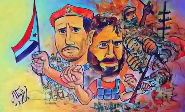 أبدع الفنان أشرف كمال فى نقل تاريخ القضية الجنوبية من خلال لوحة ملحمة جنوبية حيث أنه أبدع فى نقل الحقيقة ويظهر شعب الجنوب المناضل فى اللوحة وهو يتجه ببلده من ظلمات الإحتلال البغيض إلى نور الحرية وبين النور والظلام ملحمة شعبية كبيرة أستطاع الشعب الجنوبي المناضل أن يتخطى حدود الصعب ويظهر الفنان أشرف كمال أن الشعب المتطوق للحرية تعدى حواجز النيران ومزق قضبان سجن الظلام وقطع السياج الشائك بيده ونزف دما إلى أن وصل لنور الفجر وأظهر الفنان أشرف كمال رموز المقاومة الجنوبية الشعبية فى مقدمة الصفوف على خط النيران متجهين نحو شمس الحرية ونرى قائد المقاومة الشعبية الشهيد العميد منير أبو اليمامة اليافعي يحمل راية الجنوب عالية فى إتجاه نور الشمس ويقف فى كتفه القيادي المناضل أبو همام اليافعى ووصفه الفنان أشرف كمال من خلال ريشته الإبداعية وألوانه المميزة أنه صاحب قبضة قوية وفى يده الأخرى السلاح لينتقل بنا الفنان أشرف كمال بهذه اللقطة الفنية إلى أحداث عدن 2019 التى شهدت إستشهاد العميد أبو اليمامة ورد فعل المقاومة الشعبية بقيادة المناضل أبو همام اليافعي ومعه شرفاء الجنوب وهذه الأحداث ترتب على أثرها رضوخ العالم وإيمانه بحق الجنوبيين فى حكم بلدهم ومن هنا جاء إتفاق الرياض الذي أقرت به المملكة العربية السعودية ليكون حلا لمشكلات اليمن من أجل إستقرار الأوضاع وترتب على إتفاق الرياض تكوين المجلس الرئاسي اليمني “حكومة المناصفة ” لتنقسم السلطة بين الحكومة الشرعية اليمنية والمجلس الإنتقالي الجنوبي برئاسة اللواء عيدروس الزبيدي الذي أصبح نائبا للمجلس الرئاسي اليمني والذي يسعى فى هذه الأيام جاهدا من أجل أن يحقق لشعب الجنوب طلباته المشروعة ومازال قلب شعب الجنوب ومقاومته وقياداته الشريفة ينبض من أجل العودة ببلادهم إلى قبل عام 1990 .