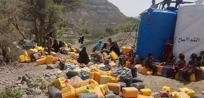 تتدافع العشرات من النساء والأطفال في الحصول على القليل من المياه من أحد الخزانات المحمولة على متن أحد العربات المخصصة لنقل المياه من مديرية ماوية شرقي تعز الى مديرية المسيمير، العربة المخصصة لنقل المياه والتي تأتي بين يوم وآخر والتي تمثل الوجهة المنقذة للعشرات من الاسر، فبمجرد قدومها من ماوية الى منطقة حبيل حنش تتزاحم حولها عشرات الأطفال والنساء لأخذ حصتهم من مياه الشرب ويصل سعر الوايت الف لتر بمبلغ ثلاثين الف ريال.