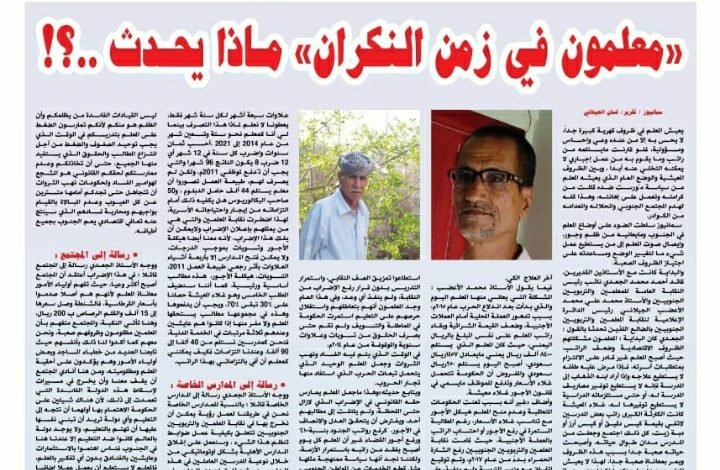 ويتابع حديثه”وهذا ماجعل المعلم يمارس حقه القانوني في الإضراب الذي لازال حتى اللحظة، ولم يلتفت إلى مطالبهم أحد، ويفترض أن يتحقق العدل والانصاف في الأجور، كرفع رواتب الجنود بنسبة١٠٠٪ ورفع أجور القضاء غير أن المعلم كل يوم أصبح يفقد من راتبه باستمرار الأزمة، ولكننا نجد أنها سياسة ممنهجة مثلها مثل قطع الخدمات عن المواطن الجنوبي، ويعود ذلك إلى الصبر على أمل الانفراج غير أن المعلم اليوم أصبح لايستطيع توفير الغذاء، ناهيك عن المطالب الأخرى، وأصبح المعلمون الفئة الأكثر فقراً والأكثر تحملاً لتبعات الحرب ونهب الثروات من قبل القيادات الفاسدة.