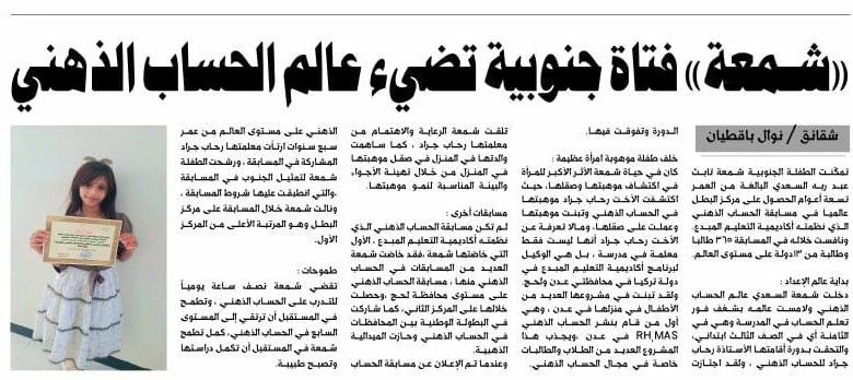 تمكّنت الطفلة الجنوبية شمعة تابث عبد ربه السعدي البالغة من العمر تسعة أعوام الحصول على مركز البطل عالميا في مسابقة الحساب الذهني الذي نظمته أكاديمية التعليم المبدع.