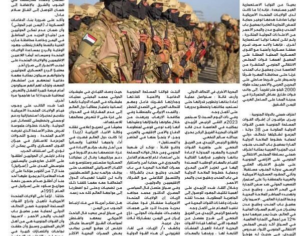 في سياق ليس ببعيد قال الباحث الأمريكي بمعهد واشنطن لسياسات الشرق الأوسط مايكل نايتس إن موقع اليمن بجانب بعض الممرات البحرية الأكثر أهمية استراتيجية في العالم سيكون ذات أهمية كبيرة للولايات المتحدة وخصومها في المستقبل ، مشددا على أنه لا ينبغي السماح له بالوقوع بالكامل تحت سيطرة الحوثيين أو من وصفهم بـ حزب الله الجنوبي.