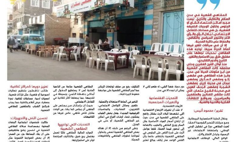 المقاهي الشعبية في عدن السلام والتعايش والتاريخ، ليست مجرد أماكن لاحتساء الشاي أو الجلوس وتناول الوجبات الخفيفه الشعبية، بل هي مساحات للتفاعل الاجتماعي، تبادل الرأي والرأي الآخر والتنوير السياسي والثقافي، والحفاظ على ذاكرة المدينة.