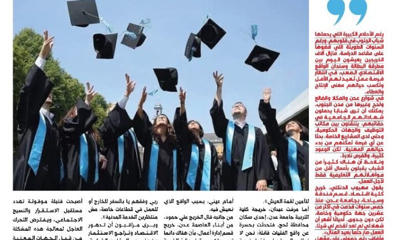 رغم الأحلام الكبيرة التي يحملها شباب الجنوب في قلوبهم، ورغم السنوات الطويلة التي قضوها على مقاعد الدراسة، مازال آلاف الخريجين يعيشون اليوم بين مطرقة البطالة وسندان الواقع الاقتصادي الصعب، في انتظار فرصة عمل تُعيد لهم الأمل وتُكسب حياتهم معنى الإنتاج والعطاء.