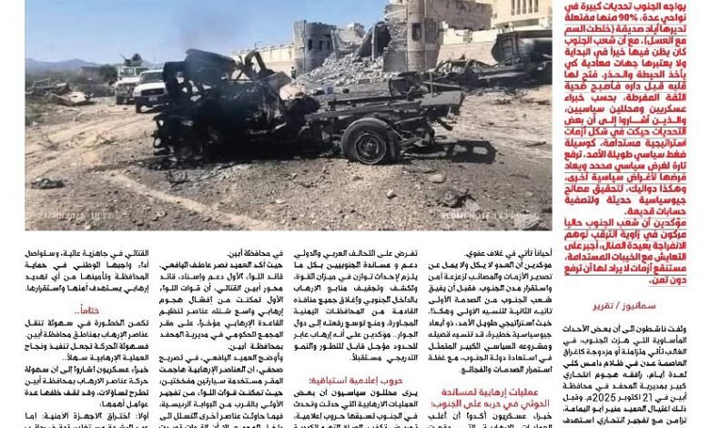 معطيات ومؤشرات خطيرة يراها الخبراء العسكريون لحرب غير متكافئة، تفرض على التحالف العربي والدولي دعم و مساندة الجنوبيين بكل ما يلزم لإحداث توازن في ميزان القوة، ولكشف وتجفيف منابع الإرهاب بالداخل الجنوبي وإغلاق جميع منافذه القادمة من المحافظات اليمنية المجاورة، ومنع توسع رقعته إلى دول الجوار.. مؤكدين على أنه إرهاب عابر للحدود مؤجل قابل للتطور والنمو التدريجي مستقبلاً.