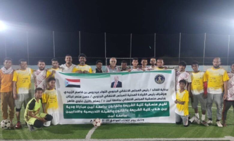 برعاية كريمة من الرئيس القائد عيدروس قاسم الزبيدي، رئيس المجلس الانتقالي الجنوبي، نائب رئيس مجلس القيادة الرئاسي، وحسن غيثان رئيس مجلس انتقالي المحافظة، والدكتور يسلم بالليل رئيس منسقية جامعة أبين نظمت منسقية كلية الشريعة والقانون برئاسة الأستاذ: عمرو مختار مباراة ودية مساء الأربعاء، وذلك في ملعب (الجوهرة) بمدينة جعار.