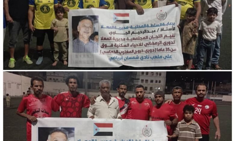 ضمن منافسات الدوري الرمضاني للمجموعة الثالثة للربع النهائي الذي تنظمه اللجان المجتمعية بمديرية المعلا فوق سن 35 سنة خروج المغلوب برعاية السلطة المحلية بالمديرية والتي تقام على ملعب الفقيد حسين سالم باوزير ( شمسان) بحضوراللجنة المنظمة للدوري والممثلة بسكرتير الشباب والرياضة في اللجان المجتمعية بالمعلا الكابتن غالب عبده ( ابو حبيب ) وأمين عام نادي شمسان الرياضي الكابتن جميل المقطري ( أبو عمرو) ٠