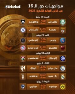 وتنطلق منافسات ثمن النهائي بعد غد الأحد بمواجهة برازيلية خالصة بين بالميراس وبوتافوغو بينما يبقى الصدام الأبرز بين باريس سان جيرمان الفرنسي وإنتر ميامي الأمريكي بقيادة نجمه الأرجنتيني ليونيل ميسي.