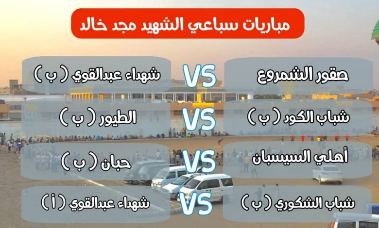 وقد اوضح رئيس لجنة البطولة الكابتن حسين فدعق ان هذة السباعي اقيمت على اساس تنشيط الفرق والمنطقة بشكل خاص ولفت الى ان اول مباريات البطولة ستبدأ بمباراة يلتقي فيها فريقي صقور السمبل و جيل الممدارة ، و تليها مباراة فريق الطيور و الشهيد رامي الجبل ، و تليها مباراة نجوم الباتو و مستقبل الشيخ ثم مباراة فريقي شباب الكود و شباب الشكوري و تليها مباراه فريقي صقور المشروع و شهداء عبدالقوي و تليها مباراه فريقي شباب الكود و الطيور و تليها مباراه فريقي اهلي السيسبان و حبان و تليها مباراه فريقي شهداء عبدالقوي و شباب الشكوري ..