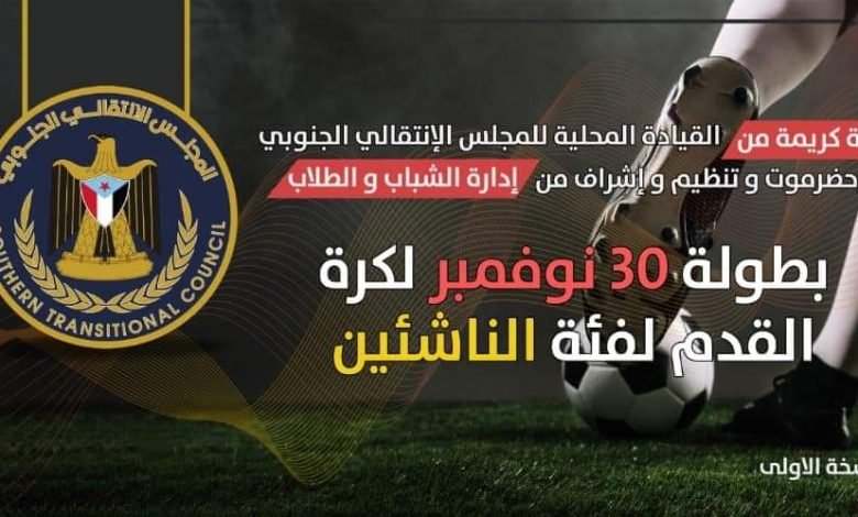 تدوي مساء اليوم السبت ، بملعب كوكب حي السلام بمدينة المكلا ، صافرة أولى مباريات النسخة الأولى من بطولة 30 نوفمبر في كرة القدم ، للفرق الشعبية لفئة الناشئين ، التي ترعاها الهيئة التنفيذية للقيادة المحلية للمجلس الانتقالي الجنوبي بمحافظة حضرموت ، ممثلة بإدارة الشباب والطلاب ..