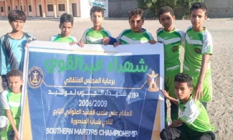 ضمن منافسات بطولة شهداء الجنوب للاشبال فئة 2008/2009 ، والتي تقام برعاية المجلس الانتقالي الجنوبي ، وبتنظيم من الكابتن سعيد جازع والكابتن عمر السو والكابتن راجي ابو خالد والكابتن محمد سالم ، وبمشاركة 48 فريقا شعبيا من مختلف مديريات محافظة عدن يلعبون بنظام خروج المغلوب على مرة واحدة ، و تقام منافساتها على ملعب مدرسة سعيد ناجي بمنطقة حاشد مديرية المنصورة .