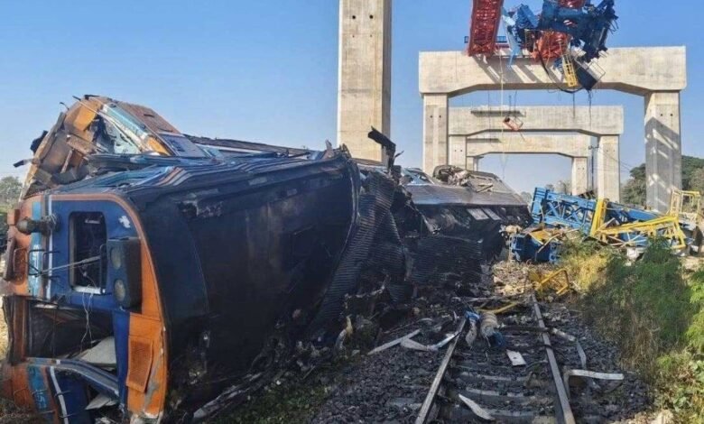 وأظهرت لقطات حية بثتها وسائل إعلام محلية عمال إنقاذ وهم يهرعون إلى موقع الحادث، مع خروج قطار عن مساره مع تصاعد الدخان من الحطام.