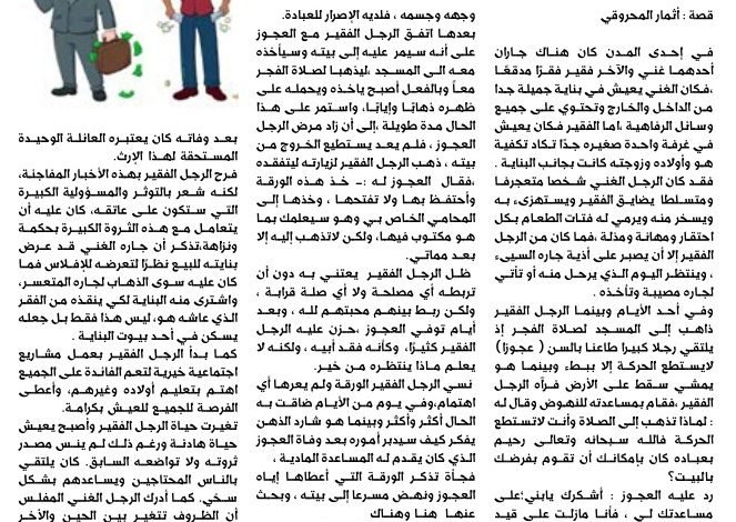 بعدها اتفق الرجل الفقير مع العجوز على أنه سيمر عليه إلى بيته وسيأخذه معه الى المسجد ،ليذهبا لصلاة الفجر معاً وبالفعل أصبح ياخذه ويحمله على ظهره ذهابًا وإيابًا، واستمر على هذا الحال مدة طويلة ،إلى أن زاد مرض الرجل العجوز ، فلم يعد يستطيع الخروج من بيته ، ذهب الرجل الفقير لزيارته ليتفقده ،فقال العجوز له :- خذ هذه الورقة وأحتفظ بها ولا تفتحها ، وخذها إلى المحامي الخاص بي وهو سيعلمك بما هو مكتوب فيها، ولكن لاتذهب إليه إلا بعد مماتي.