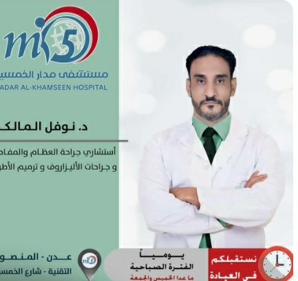 إعلان لكافة المرضى المعاقين في مديرية حالمين نؤكد لكم بأن د. نوفل المالكي استشاري في جراحة العظام وترميم الأطراف والكسور وحالات الإعاقة بكل أشكالها سيكون قريباً في مستشفى حالمين العام حبيل الريدة لمعاينة كافة حالات الإعاقة ..كواجب إنساني من هذا الرجل الإنساني لكافة المرضى المصابين بالتشوهات الخلقية في المديرية .