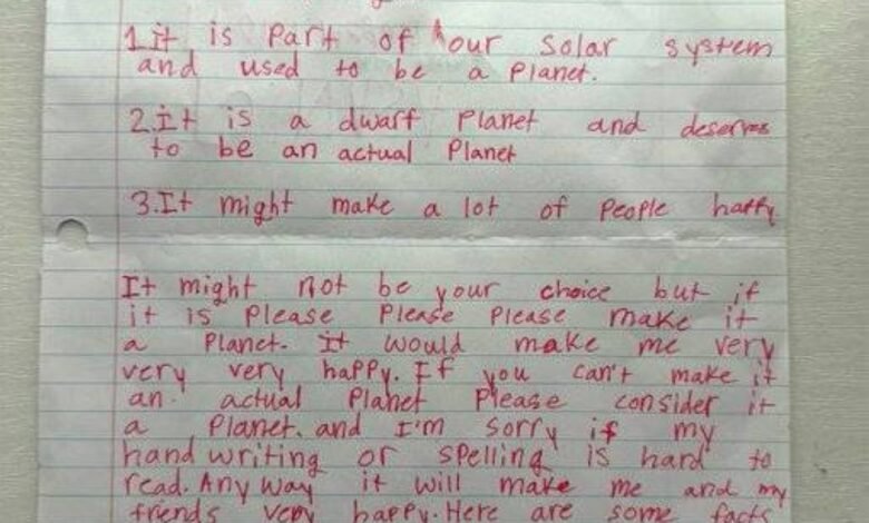 بدأت كايلا رسالتها بعبارة: “أرجوكم، أعيدوا بلوتو إلى رتبة كوكب، أريده حقاً أن يكون كوكباً مرة أخرى”، ثم قدّمت ثلاثة أسباب تراها منطقية: أنه جزء من النظام الشمسي، وأنه كوكب قزم يستحق أن يُعامل ككوكب، وأن هذا القرار قد يسعد الكثير من الناسن وأظهرت الطفلة معرفة واضحة ببلوتو، إذ أشارت إلى أنه يقع في حزام كايبر، وقدمت طلبها بإصرار وعاطفة كبيرين وفق iflscience.