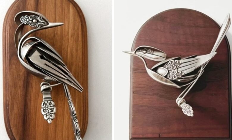 يحوّل الفنان مات ويلسون، أدوات المائدة المعدنية من ملاعق وأشواك وغيرها إلى منحوتات فنية فريدة، على أشكال الطيور والكائنات الطبيعية.
