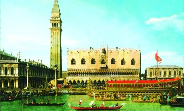 وتُعد اللوحة استثنائية، بسبب حجمها الكبير وتكوينها العمودي، وقد رسمت خلال فترة إقامة كاناليتو في إنجلترا، وتظهر مشهداً احتفالياً شهيراً في البندقية، يتضمن قصر الدوق، والجندولات، وسفينة الدوق الرسمية المزخرفة، في صورة كانت تلقى رواجاً كبيراً لدى نبلاء أوروبا، خلال رحلاتهم في القرن الثامن عشر