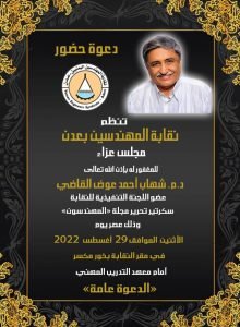 كما تم خلال المجلس الذي اقيم في مقر نقابة المهندسين بخورمكسر، توزيع نشرة إعلامية تضمنت سيرة حياة الفقيد الكبير د. م. شهاب القاضي وابرز المحطاة الهامة والمثمرة في حياته .
