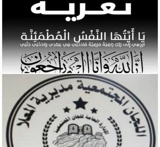تتقدم قيادة اللجان المجتمعية بمديرية المعلا ممثلة برئيسها الأخ مهران ناصر مهدي ونائبه العميد منصور عبدالله اليماني ونيابة عن سكرتاريات وأعضاء اللجان المجتمعية بالمديرية والأحياء السكنية بتعازيهم الحارة ومواساتهم القلبية للأستاذ عبدالناصر العماد نائب مدير عام مديرية المعلا وذلك بوفاة عمه يومنا هذا السبت 12 إبريل 2025م.