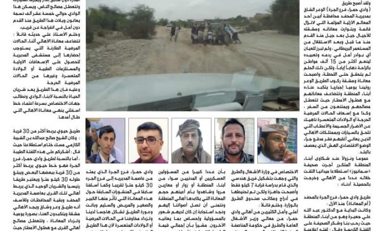 طريق وادي حمراء بمديرية المحفد في أبين شاهد عيان على معاناة أزلية يتكبد مشقتها الأهالي يوميا .. فهل من منصف؟